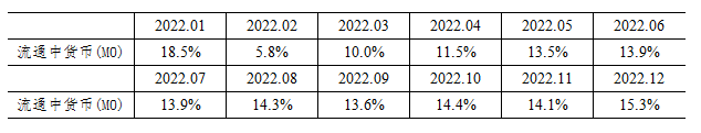 注4:自2022年12月起,“流通中货币(M0)”含流通中数字人民币。12月末流通中数字人民币余额为136.1亿元。修订后,2022年各月末M1、M2增速无明显变化。修订后M0增速如下:
